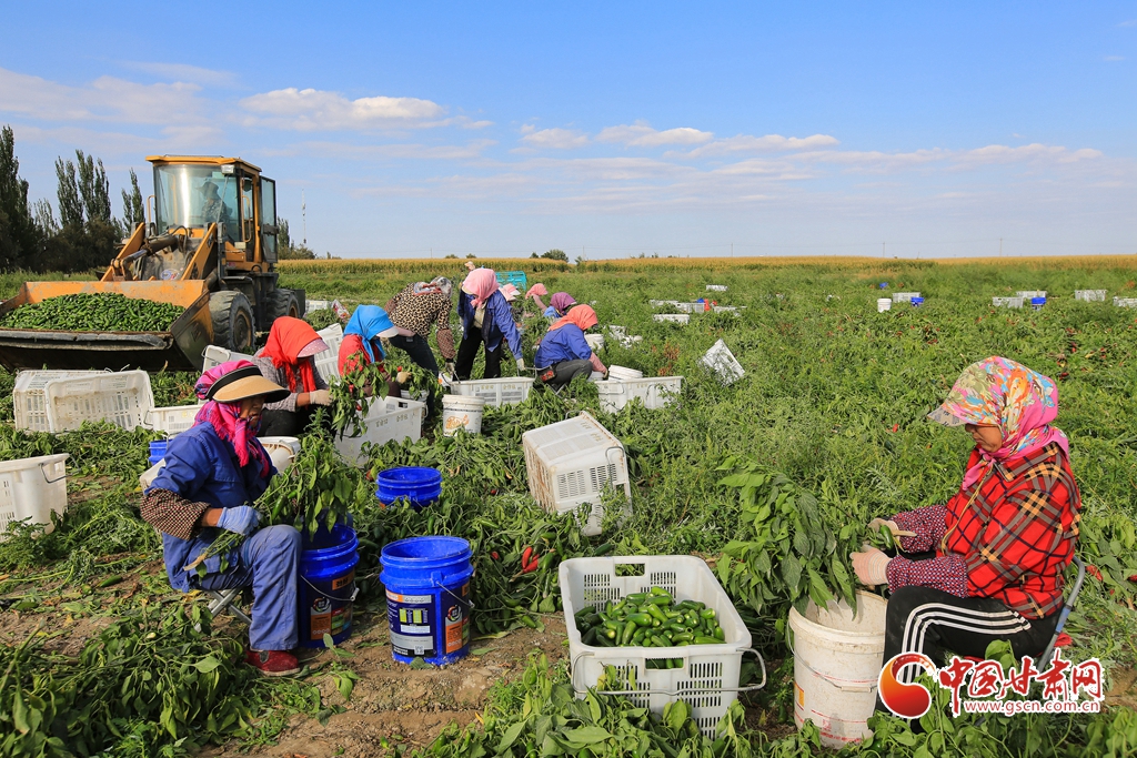 9月1日,嘉峪關市新城鎮(zhèn)長城村一農民專業(yè)合作社種植的子彈頭辣椒喜獲豐收,種植戶搶抓農時采摘,農用機械車輛穿梭于田間地頭,鄉(xiāng)村田野呈現(xiàn)出一派繁忙的景象。