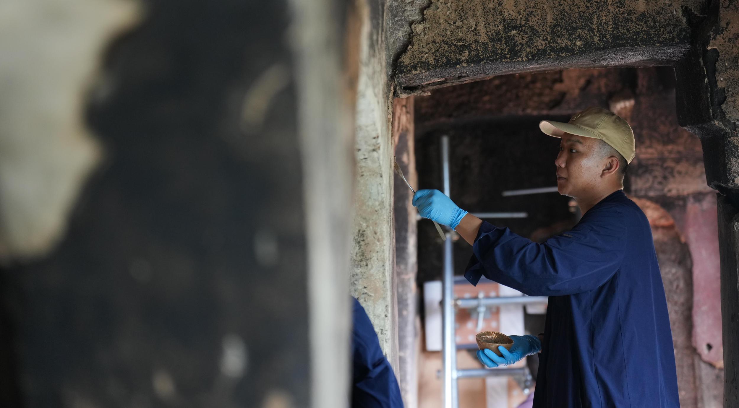 △工作人員對麥積山石窟進(jìn)行保護(hù)修繕。(總臺(tái)國廣記者李晉拍攝)