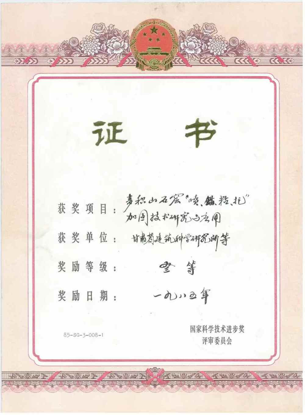 鑒定認(rèn)為,麥積山石窟維修加固工程在總結(jié)了國內(nèi)巖體加固經(jīng)驗的基礎(chǔ)上,結(jié)合麥積山石窟巖體的特點和不改變原狀的原則,成功地采用了“噴、錨、粘、托”綜合加固技術(shù),為保護(hù)石窟文物開創(chuàng)了一條新的途徑。1985年,甘肅建科院榮獲國家科技進(jìn)步獎三等獎、甘肅科技成果獎二等獎。