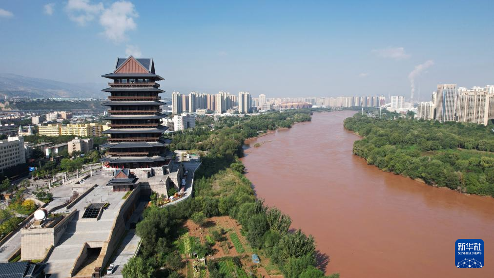 這是位于黃河蘭州段南岸的黃河樓(9月26日攝,無人機照片)。新華社記者陳斌攝