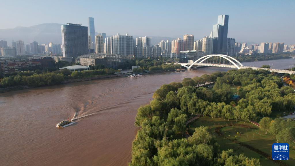 一艘水上巴士從黃河蘭州段航道上駛過(10月17日攝,無人機照片)。新華社記者陳斌攝