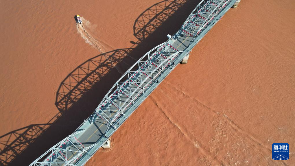 一艘快艇從黃河蘭州段中山橋下駛過(9月23日攝,無人機照片)。新華社記者陳斌攝