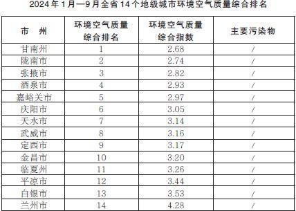 2024年1月—9月,全省14個(gè)地級(jí)城市環(huán)境空氣質(zhì)量綜合排名由高到低分別為:甘南州、隴南市、張掖市、酒泉市、嘉峪關(guān)市、慶陽(yáng)市、天水市、武威市、定西市、金昌市、臨夏州、平?jīng)鍪?、白銀市、蘭州市。