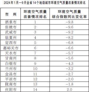 2024年1月—9月,全省14個(gè)地級(jí)城市環(huán)境空氣質(zhì)量改善情況排名由好到差分別為:酒泉市、張掖市、武威市、臨夏州、定西市、嘉峪關(guān)市、天水市、甘南州、白銀市、蘭州市、金昌市、平?jīng)鍪小㈦]南市、慶陽(yáng)市。