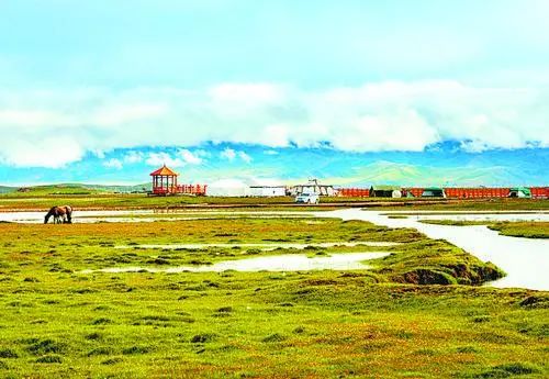 河曲馬場景區(qū)以熱爾欽濕地草原、熱爾欽湖為主要自然景觀,目前建有神駒廣場、高原馬術(shù)活動基地、步行街、親水濕地觀光平臺、星空帳篷酒店、房車帳篷營地、熱氣球觀光基地、瑪緹高端酒店等配套附屬設(shè)施。大自然在這里集高原湖濱濕地、沼澤濕地、高寒草原于一體,構(gòu)成了復(fù)合型的別樣景觀。