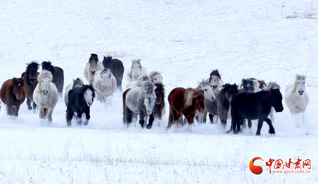 1月30日,張掖市肅南裕固族自治縣康樂草原上,康豐村牧民策馬馳騁,百匹駿馬踏雪奔騰,牧民們用這種獨特的方式迎接即將到來的新春。