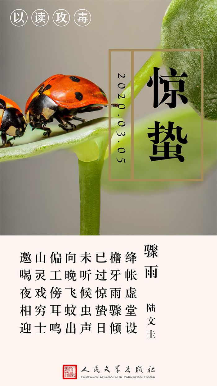 “萬卷古今消永晝,一窗昏曉送流年”,在抗疫重于踏青、防毒甚于訪友的當下,一書在手物我兩忘的閱讀就是宅家攻毒的法寶。“我讀,故我在”,自新華網悅讀頻道在其元宵節(jié)海報上首倡“以讀攻毒”至今,“以讀攻毒”已成文化界熱詞。今日驚蟄,萬物復蘇,為給居家久蟄的人們鼓勁祈福,展現(xiàn)新華網悅讀推廣人聯(lián)盟與全國人民一道守望相助、共克時艱,新華網客戶端、新華網悅讀頻道、新華網公益頻道特舉辦“以讀攻毒同題公益海報聯(lián)展”活動,以此祈愿國泰民安、山河無恙!祈愿每一位讀者讀有所獲、安康順意!