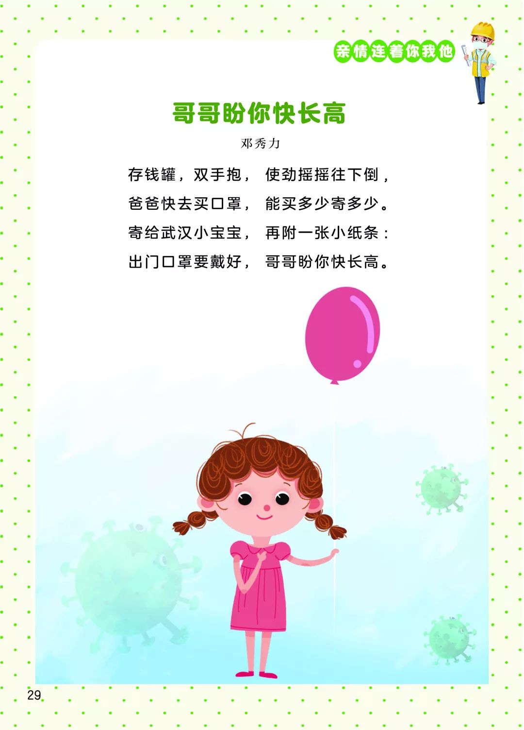 新冠肺炎疫情爆發(fā)以來,全國人民積極投入到疫情防控阻擊戰(zhàn)中,孩子們、兒童文學作家也紛紛發(fā)聲,創(chuàng)作了大量優(yōu)秀的童謠。每一首童謠是一聲鼓勁的吶喊,匯集起來就是嘹亮的戰(zhàn)歌;每一首童謠點亮一束希望的光,光束匯聚就是光明的未來。