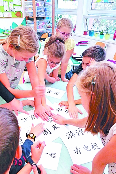 在匈牙利首都布達(dá)佩斯,匈中雙語(yǔ)學(xué)校的學(xué)生在課堂上復(fù)習(xí)漢語(yǔ)生詞。新華社發(fā)