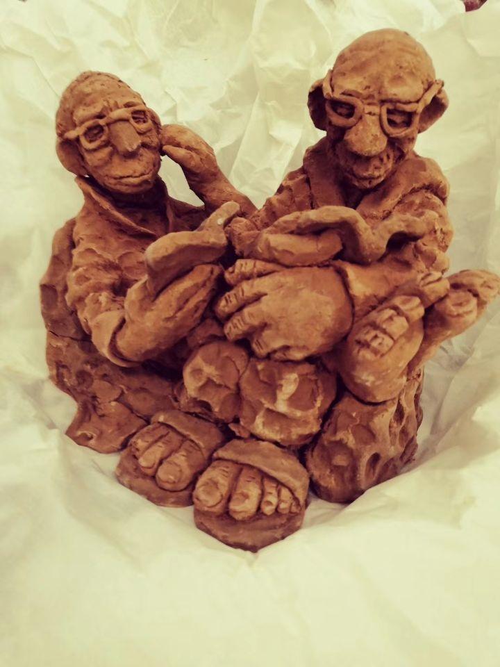 一個(gè)人的藝術(shù)成就,在多個(gè)領(lǐng)域里綻放,是一件難以置信的事情。劉老師的泥巴,玩出了她自己的風(fēng)采。三盆泥巴,事先由主辦方備制好。像和面一樣,醒泥巴,摔泥巴,軟硬適宜。人還沒到合作,泥巴早已備好。