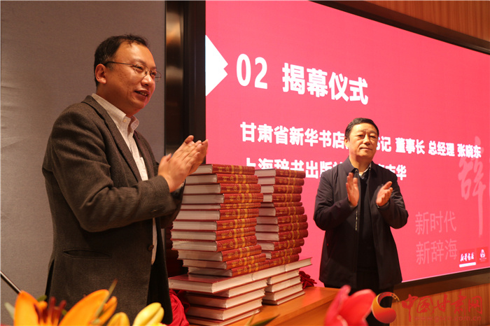 甘肅省新華書(shū)店黨委書(shū)記、董事長(zhǎng)、總經(jīng)理張曉東(右)與上海辭書(shū)出版社社長(zhǎng)秦志華(左)共同為首發(fā)式揭幕。