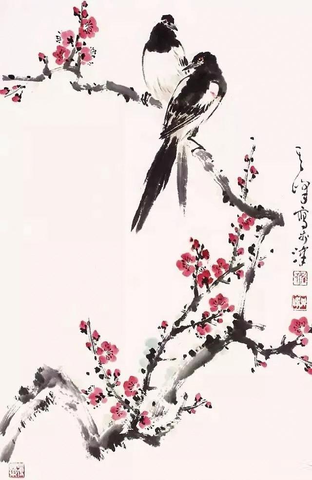 那是我第一次看見梅花,墨黑的枝干上,稀稀疏疏臥著幾朵紅紅的梅花,很安靜。畫上有四個(gè)字:傲雪紅梅。兩邊還有對(duì)聯(lián),內(nèi)容已經(jīng)不記得了。正值外面大雪紛飛,院子里已落了一層白白的積雪,一時(shí)間詩(shī)意悠然。對(duì)著那副梅花圖,清清爽爽的,令人內(nèi)心好快樂(lè)。那時(shí),我在讀《紅樓夢(mèng)》,只記住了那句:琉璃世界白雪紅梅。