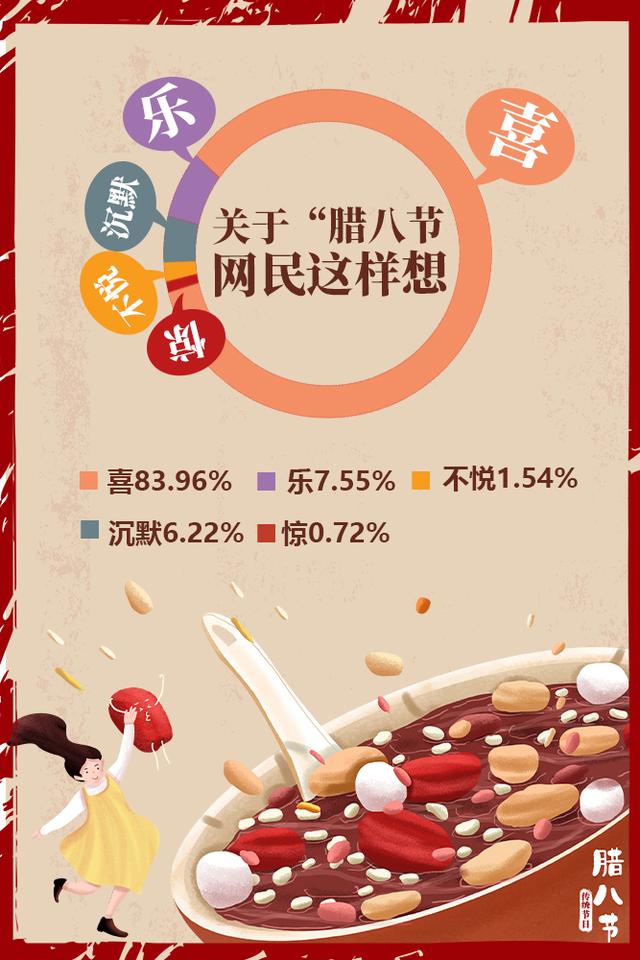 雖然今年多地的臘八節(jié)活動因疫情而取消,但是人們對于團圓、祥和、富裕、康寧、平安的期盼從未改變。有關(guān)“臘八”的網(wǎng)民情緒分布中,“喜”占83.96%,“樂”占7.55%??傮w來說,開心喜悅的情緒占到了九成以上。