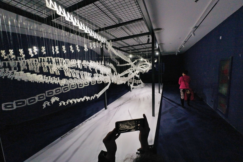 2022年1月3日,天津國圖·津灣文創(chuàng)空間舉辦,甲骨文創(chuàng)意展,一名參觀者用手機(jī)拍攝甲骨文懸空雕塑。 中新社記者 佟郁 攝