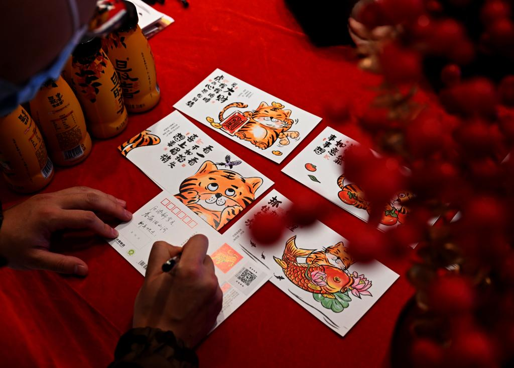 2月6日,市民在明信片上寫(xiě)下詩(shī)詞。