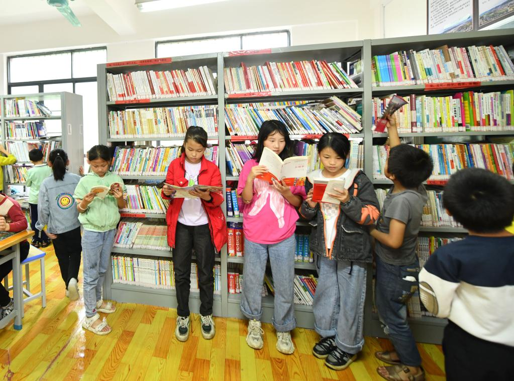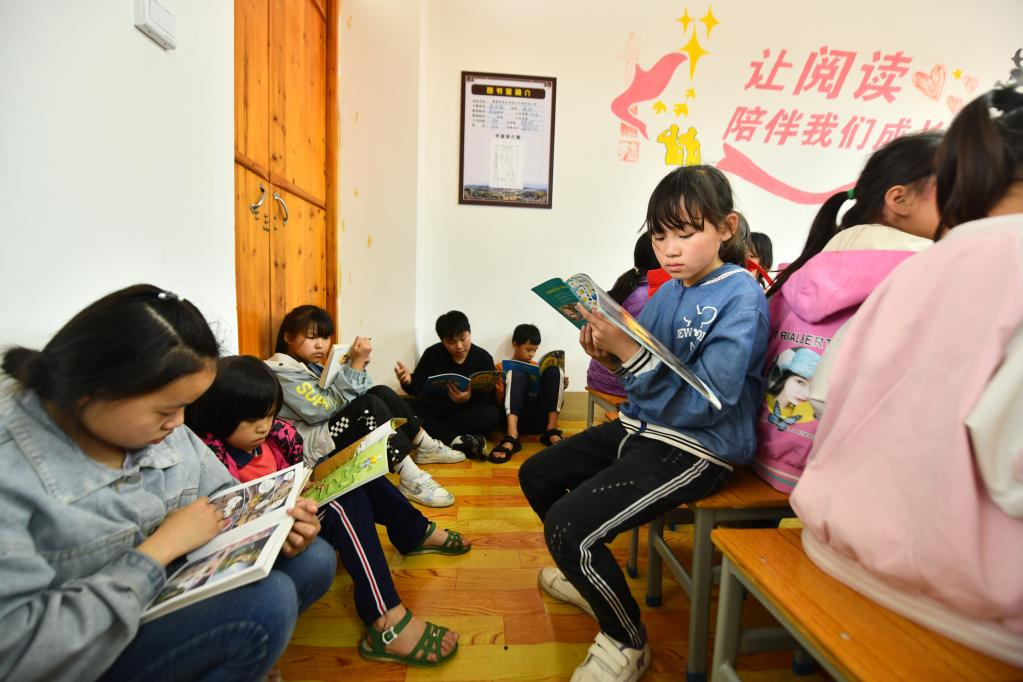 骨龍村小學學生在圖書室閱讀(5月25日攝)。