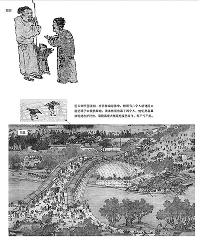 《清明上河圖》在后世有兩種重要的仿本,一個是明代仇英款仿本,一個是清院本。在本文結束之前,我要以清院本中的虹橋為例,來說明仿本與張擇端原作的一個重要差別。請看圖五,那就是清院本中的虹橋,那橋梁雄偉壯大,氣勢如虹,是吧?再看船與橋的關系,船很大,但桅桿早就放下來,完全可以順利通過。再看那些人物,他們小小的,就像螞蟻。他們像螞蟻,不是因為我們把圖縮得小,實際上,即使放大,也無法看出他們的個性、情緒,換句話說,這些人與其說是人,不如說是一些符號。把人符號化與賦予人物個性,這是仿本與原作的極大區(qū)別,也是我極力推崇原作的原因所在。《清明上河圖》,我們就看到這里。(文并供圖/田玉彬)