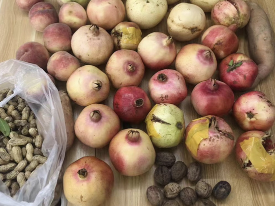 2019年10月10日收到一箱果品,一張字條寫著:“甜石榴21個(gè),酸石榴5個(gè)(石榴皮上有膠帶和‘酸’字),甜梨5個(gè),美人紅桃子,地瓜2塊,花生,核桃(不好看,請品嘗)。”