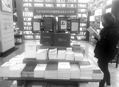 北京王府井書店設(shè)立主題出版類圖書展臺(tái)。
