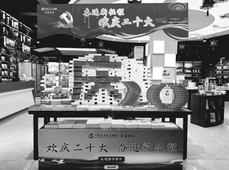廣西新華書店集團(tuán)股份有限公司組織全區(qū)各連鎖門店先后開展了“喜迎二十大 助力新發(fā)展”主題圖書展示展銷、“歡慶二十大 奮進(jìn)新征程”主題系列活動(dòng)。廣西新華書店集團(tuán)股份有限公司相關(guān)負(fù)責(zé)人介紹,全區(qū)門店近期開展“歡慶二十大 奮進(jìn)新征程”主題門店美陳大賽,通過精選出111個(gè)全國近期出版的主題圖書品種進(jìn)行重點(diǎn)展示,配套主題海報(bào)、背景板,以各門店融合當(dāng)?shù)靥厣拇a堆造型進(jìn)行整體美陳,向廣大讀者推薦一批導(dǎo)向正確、質(zhì)量上乘的優(yōu)秀主題圖書。