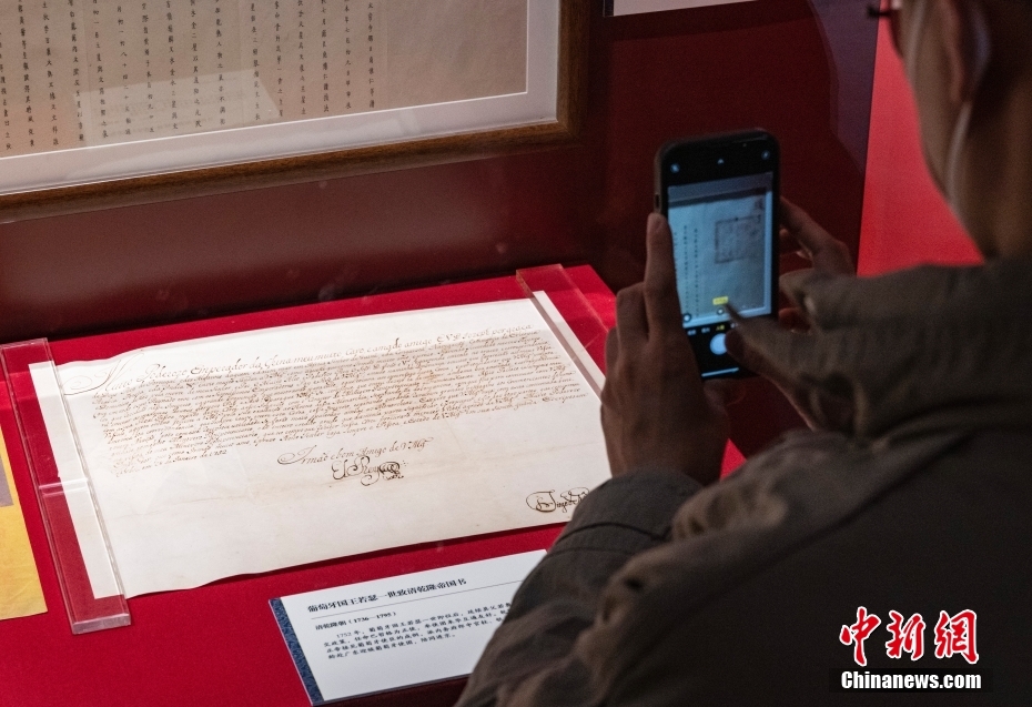 圖為“明清檔案”展區(qū)內(nèi)展示的“葡萄牙國王若瑟一世致清乾隆帝國書”展品吸引觀眾用手機(jī)記錄。 中新社記者 侯宇 攝