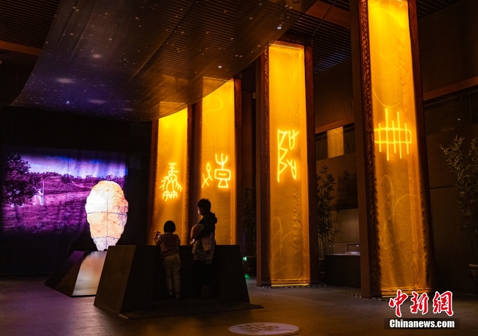 圖為“殷墟甲骨”展區(qū)內(nèi)的聲光互動區(qū)吸引觀眾體驗(yàn)。 中新社記者 侯宇 攝