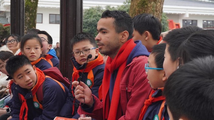走出場館,中外青年圍坐在雷鋒紀念館外的長廊暢聊雷鋒精神。在分享初到中國時迷路,被身邊一位“活雷鋒”幫助的故事時,來自阿爾及利亞的留學生名善深有體會地說到:“真正的善行是發(fā)自內心、純粹無私的。”交流中,不一樣的面孔也吸引了來自株洲市荷塘小學小朋友們的關注,在文化擺渡者志愿服務隊的翻譯下,留學生們與小朋友們打破了語言的壁壘,實現了關于雷鋒精神內涵的無障礙交流。