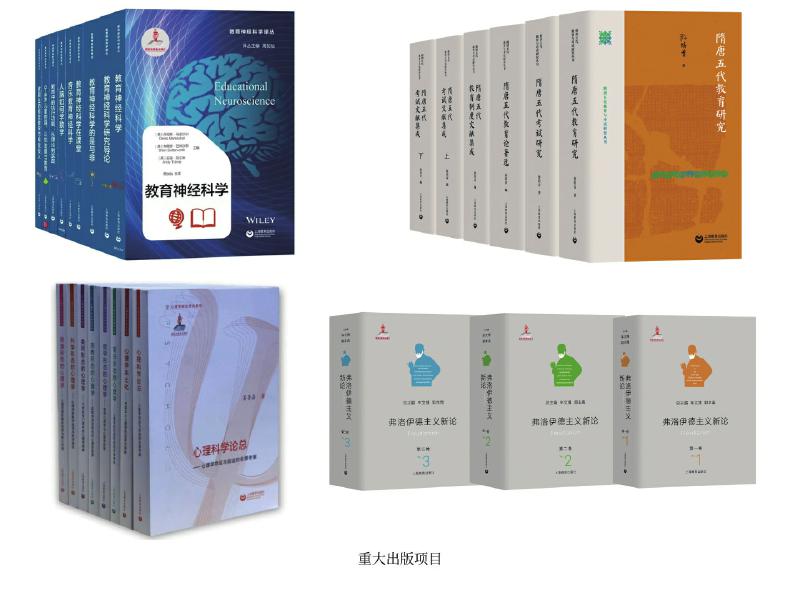 上教社密切關(guān)注新時(shí)代教育發(fā)展的重大理論問(wèn)題與現(xiàn)實(shí)問(wèn)題,響應(yīng)國(guó)家教育發(fā)展戰(zhàn)略需求,精心布局學(xué)術(shù)專業(yè)出版“大項(xiàng)目”,連續(xù)入選國(guó)家重點(diǎn)出版物出版規(guī)劃、2013—2025年國(guó)家辭書(shū)編纂出版規(guī)劃,獲國(guó)家出版基金資助。這其中除前文中的大型專科工具書(shū),還包括一系列教育與心理學(xué)原創(chuàng)研究和前沿研究成果:由中國(guó)教育史學(xué)者孫培青編著的“隋唐五代教育與考試研究叢書(shū)”,構(gòu)建了反映隋唐五代教育與考試全貌的教育理論體系和文獻(xiàn)資料體系,是中國(guó)教育史學(xué)科建設(shè)的一項(xiàng)學(xué)術(shù)文化積累工程;《中國(guó)課程史》以現(xiàn)代課程理論為分析框架,以歷史線索展現(xiàn)中國(guó)學(xué)校課程的新陳代謝;“教育神經(jīng)科學(xué)譯叢”(9冊(cè))是我國(guó)首個(gè)聚焦教育神經(jīng)科學(xué)這一國(guó)際教育研究前沿領(lǐng)域的學(xué)術(shù)譯介系列;《中國(guó)傳統(tǒng)德育心理學(xué)思想新論》系統(tǒng)挖掘整理中華優(yōu)秀傳統(tǒng)文化中蘊(yùn)含的德育心理學(xué)思想,構(gòu)建中國(guó)特色心理學(xué)話語(yǔ)體系;我國(guó)第一套以大心理學(xué)觀,從本土心理學(xué)視角系統(tǒng)探索和解讀不同形態(tài)心理學(xué)的學(xué)術(shù)系列“心理學(xué)形態(tài)研究系列”(6冊(cè)),全景考察心理學(xué)的命運(yùn)與前途,深入探索中國(guó)本土心理學(xué)的選擇與突破;《弗洛伊德主義新論》(三卷)匯聚國(guó)內(nèi)弗洛伊德主義研究領(lǐng)域的權(quán)威學(xué)者,歷史展現(xiàn)弗洛伊德理論的百年發(fā)展歷程,提供弗洛伊德主義研究的“全景圖”。這些重大出版項(xiàng)目為構(gòu)建中國(guó)特色自主知識(shí)體系,建設(shè)中國(guó)教育學(xué)和心理學(xué)學(xué)科體系、學(xué)術(shù)體系、話語(yǔ)體系發(fā)揮了重要作用。