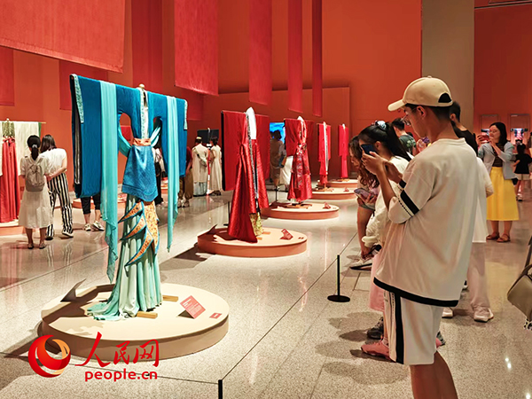 7月20日,正值周末,中國工藝美術(shù)館(中國非物質(zhì)文化遺產(chǎn)館)“五彩錦簇——中華服飾文化展”的展廳里人流如織。有人舉起手機拍照留念,有人駐足了解精湛的織造工藝,還有人在與同伴討論哪里能買到“同款”衣裝……這場中華服飾的視覺盛宴,讓眾多游客沉浸其中。