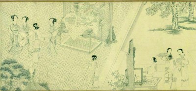 明代仇英《乞巧圖》(局部,臺北故宮博物院藏),表現(xiàn)的是在庭院中陳設(shè)幾筵、瓜果祭祀牛女的場景