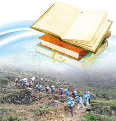 常紹慧和幾個(gè)同事先跑上山去,到村里挨家挨戶找老鄉(xiāng)借背簍,另一撥同事則在山腳下整理書(shū)籍。不一會(huì),大家把書(shū)和禮物分裝進(jìn)借到的幾個(gè)背簍里,每人背著一個(gè)背簍上山。
