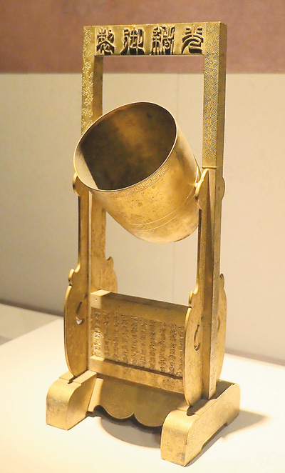 一件造型獨(dú)特的金色器物吸引了記者注意。達(dá)微佳介紹,這是故宮博物院藏清代銅鍍金欹器。欹器是一種傾斜易覆的盛水器,中空時(shí),會(huì)向一側(cè)傾斜;注水一半時(shí),能保持端正;水注滿時(shí),會(huì)傾覆倒出,生動(dòng)展現(xiàn)了儒家“不偏不倚,無過不及”的中庸之道。據(jù)文獻(xiàn)記載,孔子曾在魯桓公之廟觀欹器,并向?qū)W生講解它的道理。古時(shí)國君將欹器置于座右,作為修身之戒,因此又稱“宥坐之器”。