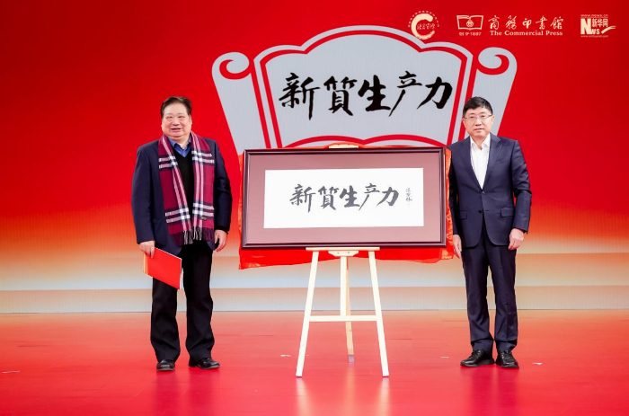 中國(guó)辭書(shū)學(xué)會(huì)會(huì)長(zhǎng)、北京語(yǔ)言大學(xué)教授李宇明(左),中國(guó)出版集團(tuán)有限公司副總經(jīng)理、黨組成員陳永剛(右)揭曉年度國(guó)內(nèi)詞“新質(zhì)生產(chǎn)力”。新華網(wǎng) 發(fā)