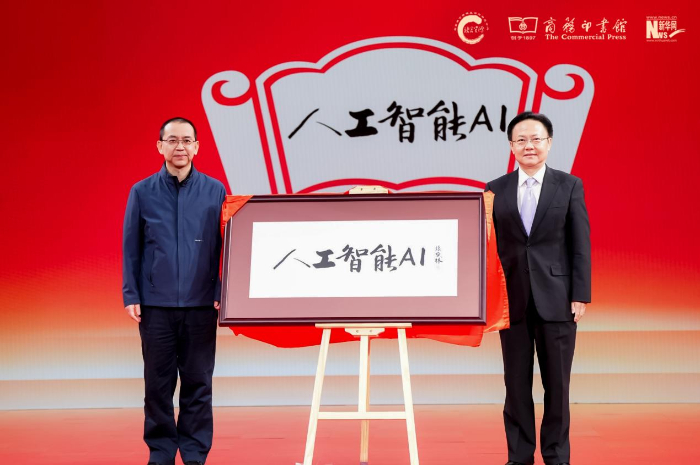 商務(wù)印書(shū)館副總經(jīng)理陳晗雨(左),中宣部“學(xué)習(xí)強(qiáng)國(guó)”學(xué)習(xí)平臺(tái)編委、副總經(jīng)理杜大力(右)揭曉年度國(guó)際詞“人工智能(AI)”。新華網(wǎng) 發(fā)