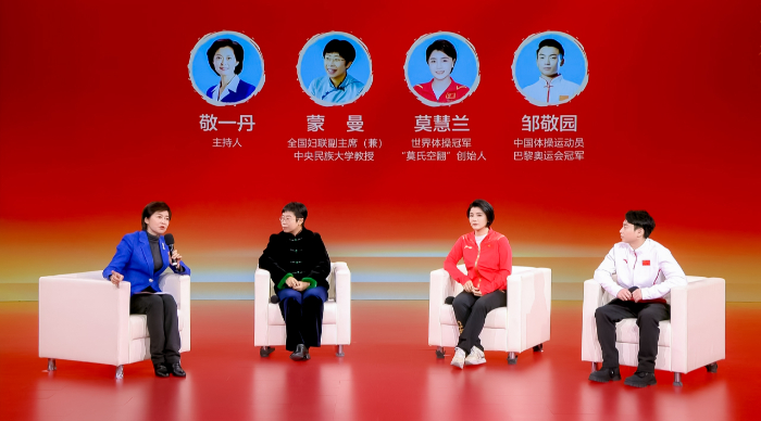 全國(guó)婦聯(lián)副主席(兼)、中央民族大學(xué)教授蒙曼,世界體操冠軍、“莫氏空翻”創(chuàng)始人莫慧蘭,中國(guó)體操運(yùn)動(dòng)員、巴黎奧運(yùn)會(huì)冠軍鄒敬園接受訪談。新華網(wǎng) 發(fā)