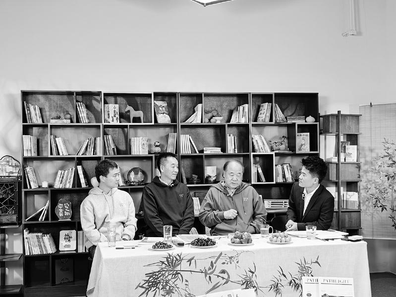 “在文學(xué)的曠野里”特別直播活動(dòng)現(xiàn)場。從左至右為讀者張志方、《人民文學(xué)》主編施戰(zhàn)軍、作家莫言、“與輝同行”負(fù)責(zé)人董宇輝。 陳濤 攝