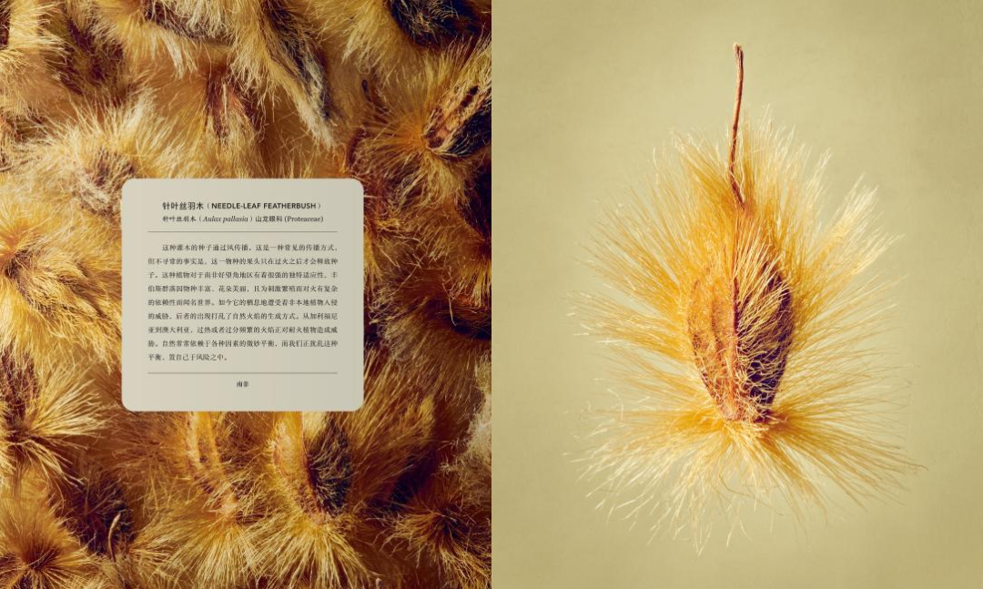 隨后,植物園耗時6個月,從3500份標(biāo)本中精心篩選出100種植物果實(shí)與種子。列文·比斯將這些攝影對象放大至80倍,捕捉到植物表面豐富多樣的細(xì)節(jié),照片的精細(xì)程度超乎想象。每張圖片還配有一段簡潔的科普文字,不僅反映了100多年來植物的采集狀況,展示了種子的傳播方式,還介紹了人類對植物材料的利用方法。