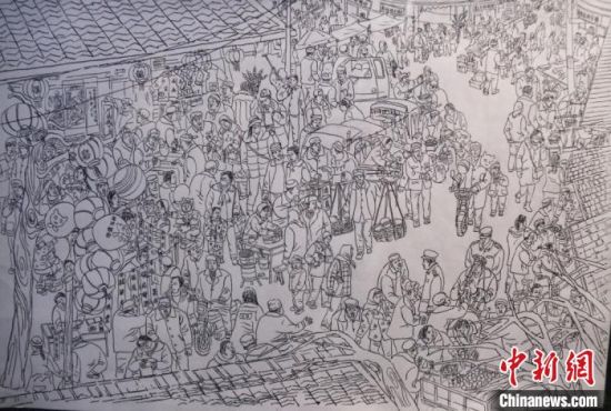 蘭州鋼筆畫愛好者周新平勾勒了數(shù)組關(guān)于鄉(xiāng)村記憶的鋼筆畫,其中,《隴西臘月圖》是他歷時(shí)三個(gè)多月,手繪了200多村民,完成的一幅舊時(shí)農(nóng)民過年趕集的熱鬧圖景:賣糖葫蘆的小販、剪紙賀春的手藝人、趕車挑擔(dān)的趕集人……周新平說,他很怕“集市文化”將來(lái)被人們遺忘,用鋼筆記錄下來(lái),留住記憶里的“年味”以感悟鄉(xiāng)愁。
