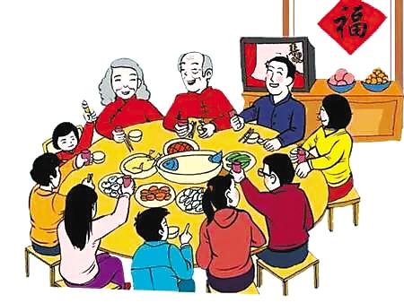 人們辛苦了整整一年,除夕晚上全家老小定要團(tuán)圓,在家中吃團(tuán)圓餃子。餃子形如元寶,取“招財(cái)進(jìn)寶”之意,餃子餡中可以包進(jìn)硬幣和干果,以寄托人們對(duì)新年的一種祈盼。這頓年夜飯可以從傍晚一直吃到天黑,席間人們多彼此祝愿的話語(yǔ),充滿歡樂(lè)溫馨氣氛。