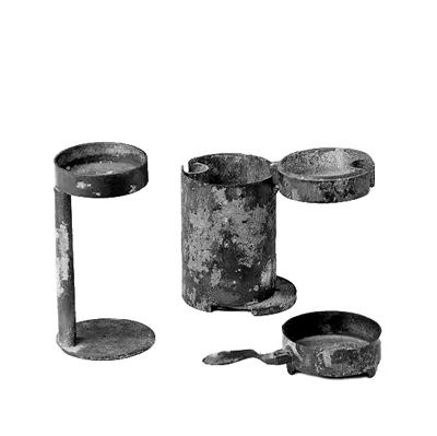 這件青銅鑄造的鼎形燈,收合時為附耳三足蓋鼎,內(nèi)盛燃燈時所用的油料,以子母口扣合。蓋中央為一突起的圓柱狀銎,蓋兩側(cè)為相對的二鴨首,其寬嘴正好銜住雙鍵,鼎蓋便被牢牢扣住。用燈時,將雙鍵支起,可插入鼎蓋中心的圓銎中,鼎蓋即成為燈盞。鼎形燈構(gòu)造精巧,設(shè)計科學(xué),使用方便,封口嚴密不溢油,為貴族出行時使用的燈。