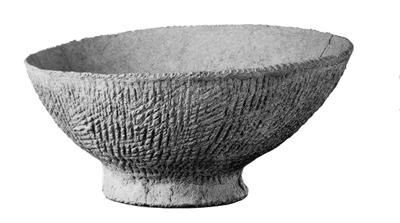 甘肅省博物館展出的一只大碗,和牛肉面大碗基本一樣。造型完全相同:圓口,口大而底小,大約一指頭寬的碗底,人們稱之為碗足。從碗足開(kāi)始,逐漸擴(kuò)展,直到碗口。不同的是,這只八千年前的碗上有大量的繩紋,是用夾砂陶燒制而成的。