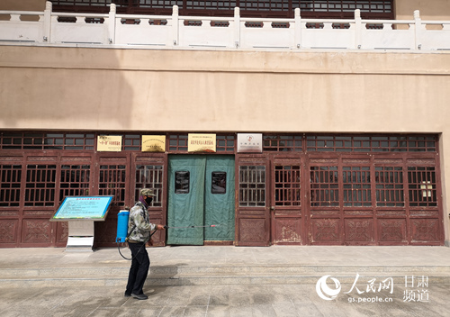 3月21日起,瓜州縣世界文化遺產(chǎn)鎖陽城遺址景區(qū)和草圣故里文化產(chǎn)業(yè)園恢復(fù)開放。圖為張芝紀念館工作人員正在進行消殺工作。(李雪 攝)