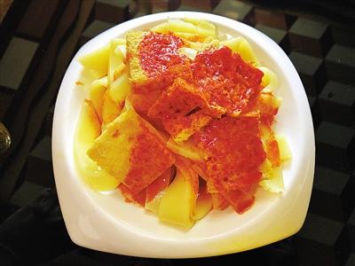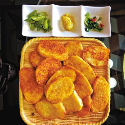 炕鍋洋芋是臨夏農(nóng)家樂(lè)里面常見(jiàn)的一道特色小吃,在臨夏,煎、烙之類的烹飪方式都被稱作炕,炕鍋洋芋因此得名。洋芋切片后,直接放熱油中兩面煎透??诲佈笥蟮淖龇m不復(fù)雜,但其對(duì)于火候的要求卻極其嚴(yán)苛,多一分會(huì)焦,少一分則不熟。