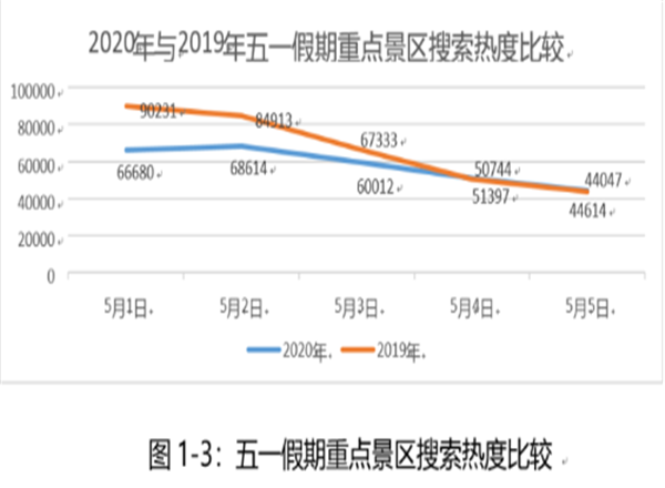 “五一”期間全省重點(diǎn)景區(qū)關(guān)鍵詞搜索熱度為29.1萬次,較去年同期33.7萬次下降13.6%。