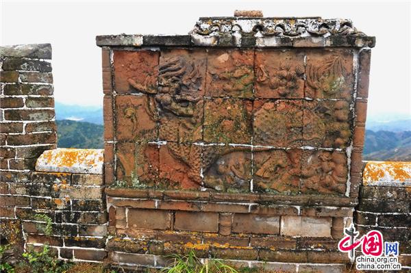 這是中國長城極為罕見、金山嶺長城的四絕之一:麒麟影壁。 它位于金山嶺長城東段的“小狐頂樓”之上。影壁墻高2米,寬2.5米,四邊鑲有磚框,中間用15塊(橫向5塊、豎向3塊)方磚,拼制成一幅浮雕的畫面,畫面中麒麟的神態(tài)動(dòng)感十足,它腳踏祥云,挺胸翹尾,鬣毛飛揚(yáng),頭回扭,張口吐舌,雙眼望向身后樓櫓上的望亭,為金山嶺長城增添了幾分活力。