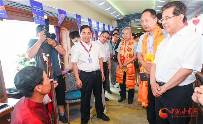 專列到達(dá)西安南站后,陜西省文旅廳及文旅相關(guān)部門對“環(huán)西部火車游”專列的到來表示熱烈的歡迎,陜西省文旅廳負(fù)責(zé)人在甘肅省委宣傳部副部長、省文旅廳黨組書記、廳長陳衛(wèi)中和武威市文體廣電和旅游局負(fù)責(zé)人的陪同下參觀了“環(huán)西部火車游”武威館,并欣賞了國家級非遺項目“涼州賢孝”表演。