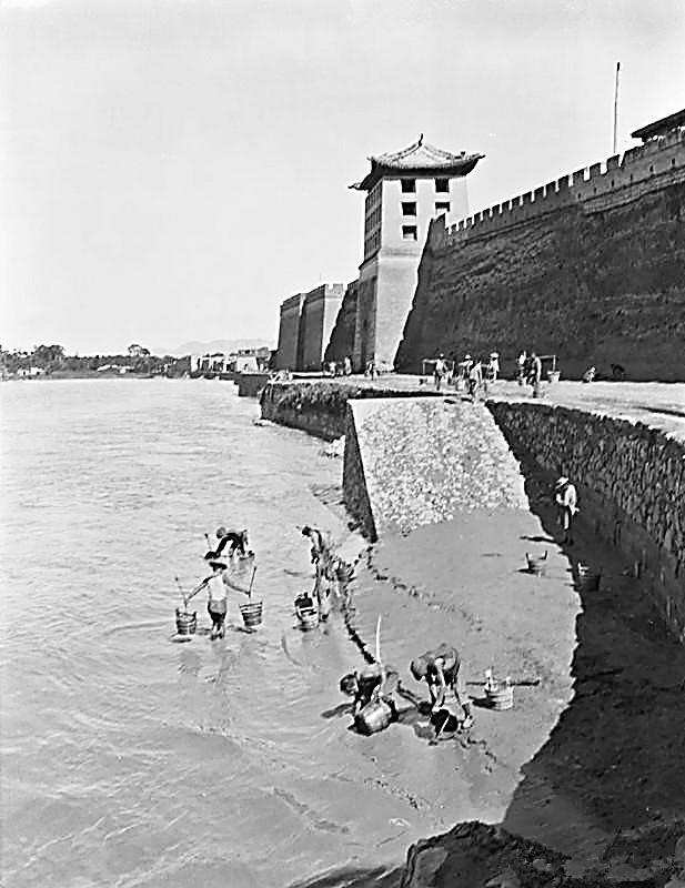 第二張是水客子在黃河中取水的情形??雌饋恚坪跏屈S河大水之后,人們從河中取水。黃河邊的石堤下,堆積的淤泥,還沒有清理。以前,蘭州城墻的位置,就是今天的南濱河路。從淤泥堆積的高度看,這次黃河大水應(yīng)該不小。