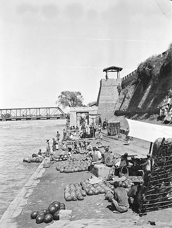 第三張照片,拍攝地點在黃河鐵橋附近,這是一處碼頭,一些人忙碌著卸西瓜,一些人靠著羊皮筏子等著人們渡河。小吃攤打著篷布,三三兩兩的人圍坐在那里,似乎是在吃釀皮子。照片上,遠(yuǎn)處是黃河鐵橋,看上去黃河水距離鐵橋的橋面比較近。由此看來,黃河的水量不小。