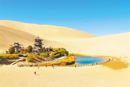 鳴沙山月牙泉是敦煌諸多自然景觀中的佼佼者,古往今來以“沙漠奇觀”著稱于世,被譽為“塞外風光之一絕”。月牙泉、莫高窟九層樓和莫高窟藝術景觀融為一體,是敦煌城南一脈相連的“三大奇跡”,成為中國乃至世界人民向往的旅游勝地。