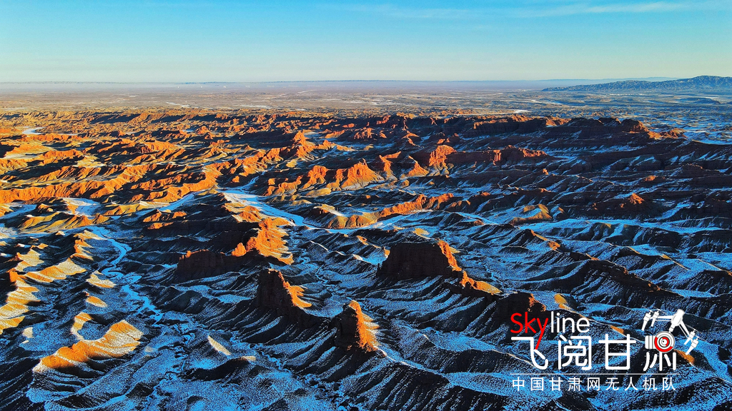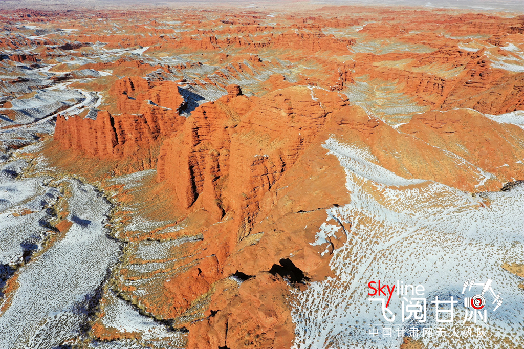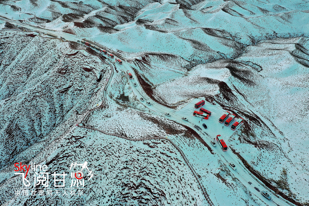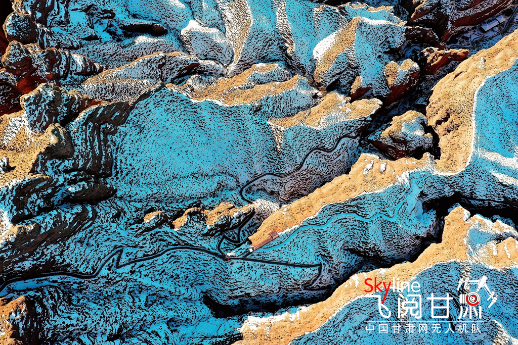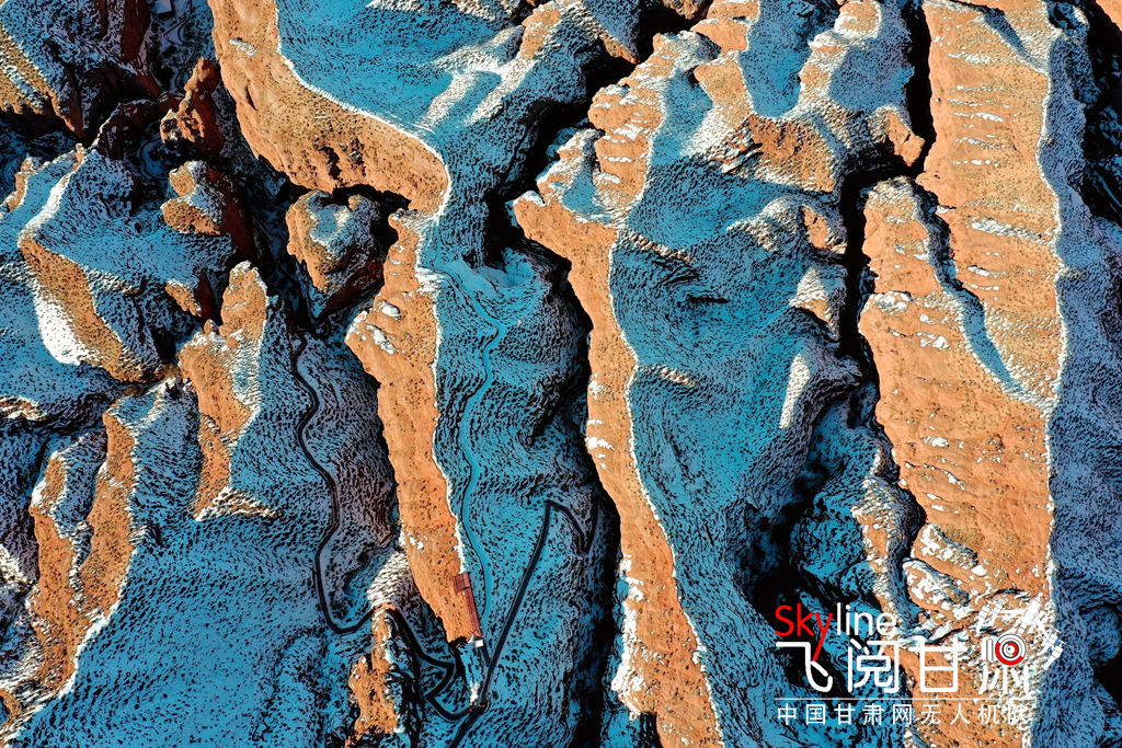 12月26日,俯瞰大雪覆蓋的甘肅省張掖平山湖大峽谷景區(qū),銀裝素裹中顯露出褐色丹霞,宛如一幅美麗畫(huà)卷,吸引眾多的游客踏雪賞景。(無(wú)人機(jī)照片)
